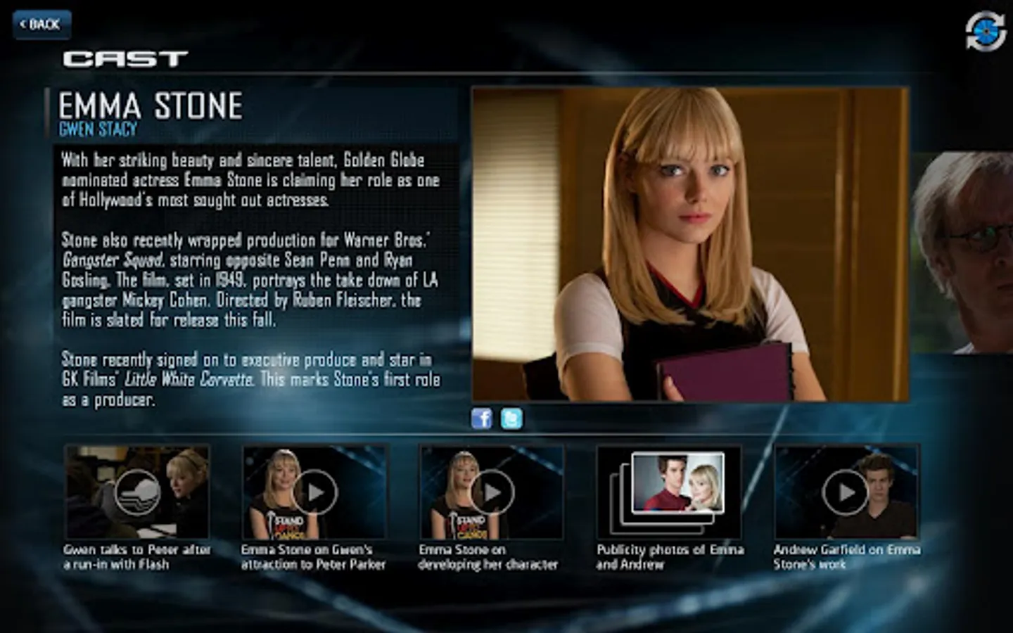 Browse through the app's Production Notes and uncover the secrets behind The Amazing Spider-Man's development, production, and completion. When you sync the app to the Blu-ray™ of the movie, your tablet will become an interactive Movie Timeline, offering scene-specific cast and crew interviews, special effects tests, stunt footage, trivia, and more.