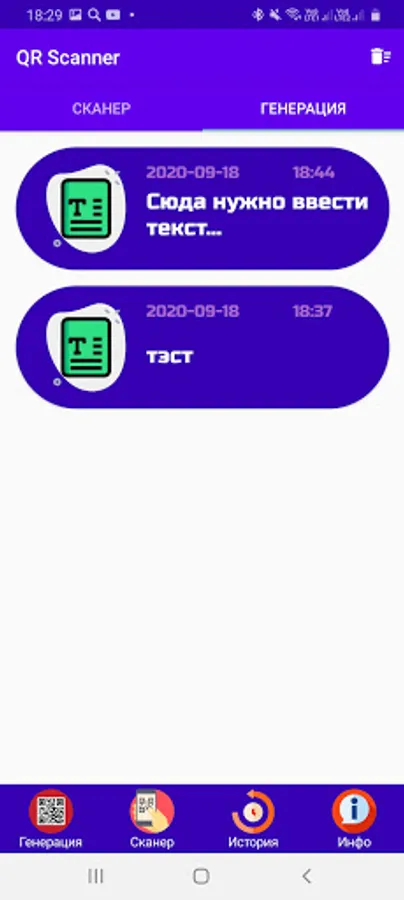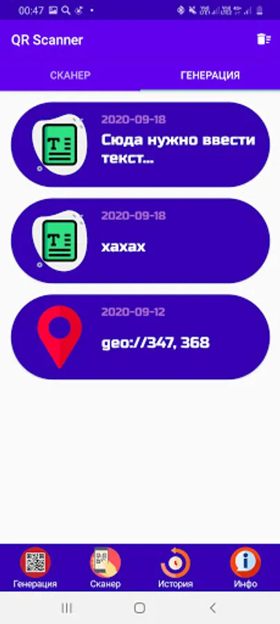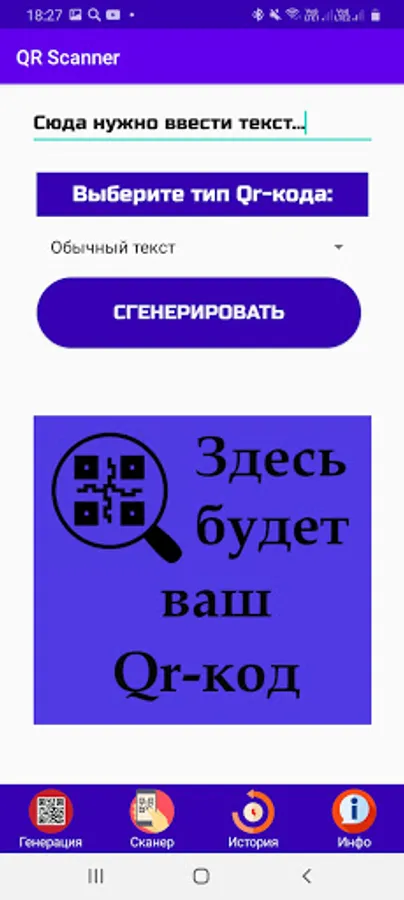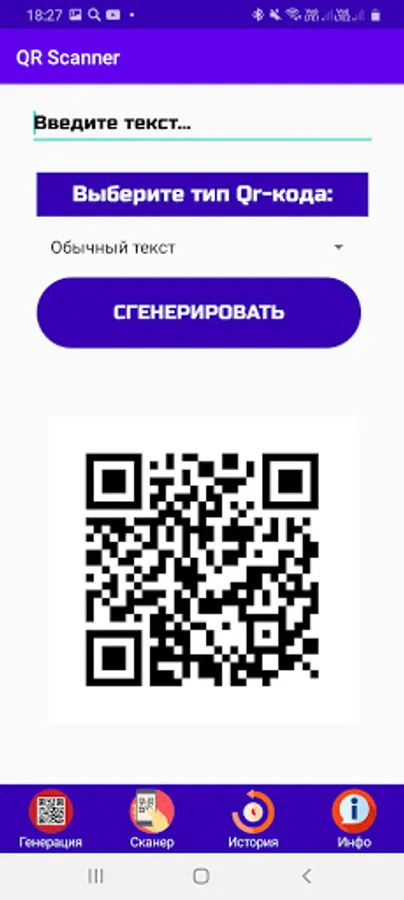 ⚡ In our application you can easily generate your own QR code, you just need to go to the menu in the "Generation" section, enter the text in the text input field, and select the type below