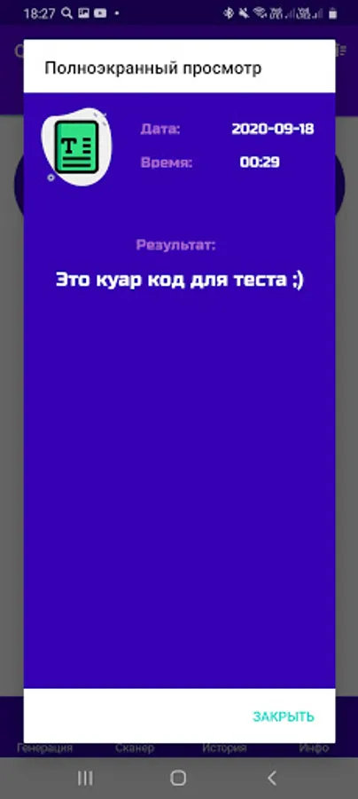 🔥 If the result of the scanned or generated Qr-code is too large and does not fit into the history item, hold your finger on the scan or generation item (in the "History" section of the menu) and you will be able to see the full text of the qr-code, its date and time!