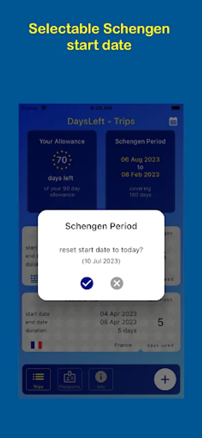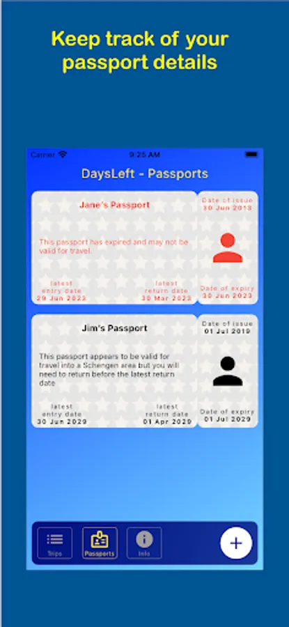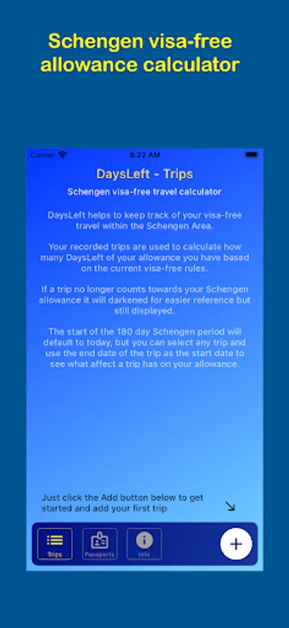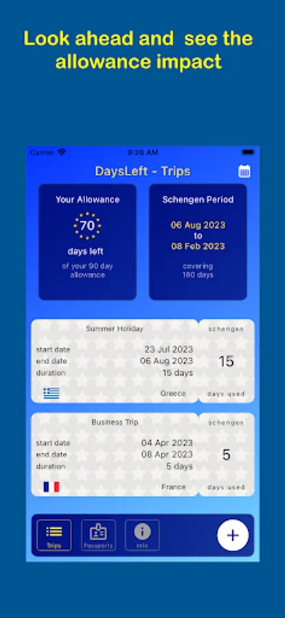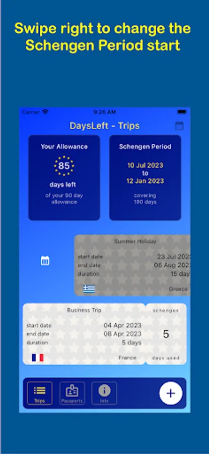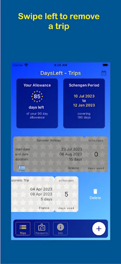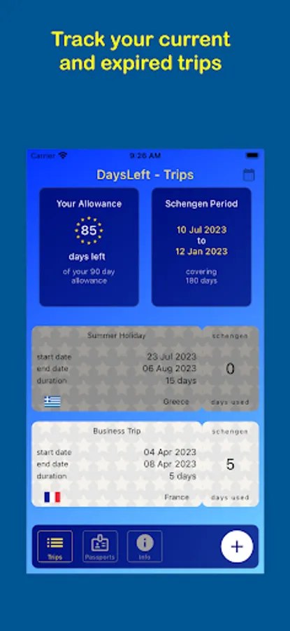 DaysLeft allows you to track and record the trips you make into the Schengen area so that you can monitor how many days of your free allowance you have left. It will show you the number of days left that you have based on the trip information that you add. It also allows you to record passport information and check when and if the passport dates are valid for travel.