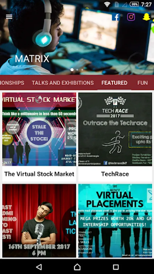 - Live Updates : Get to know any new events which have entered our roster. Get updates or crucial changes of any of the events. Get other news regarding MATRIX or any new sponsors associating with us.