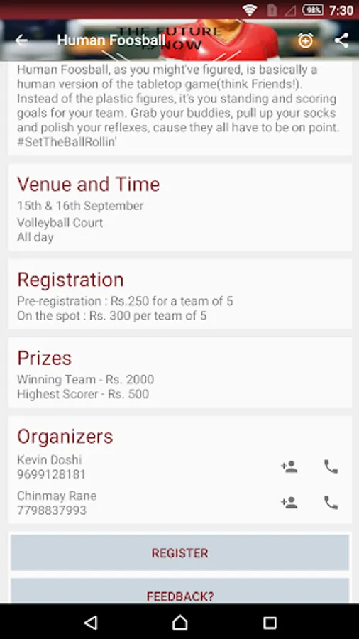 - Feedback : Didn't like an event ? Have a better suggestion? Any other difficulty? Don't hold back your feelings and let everyone know them.