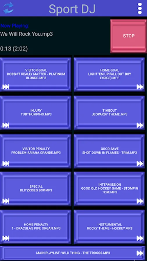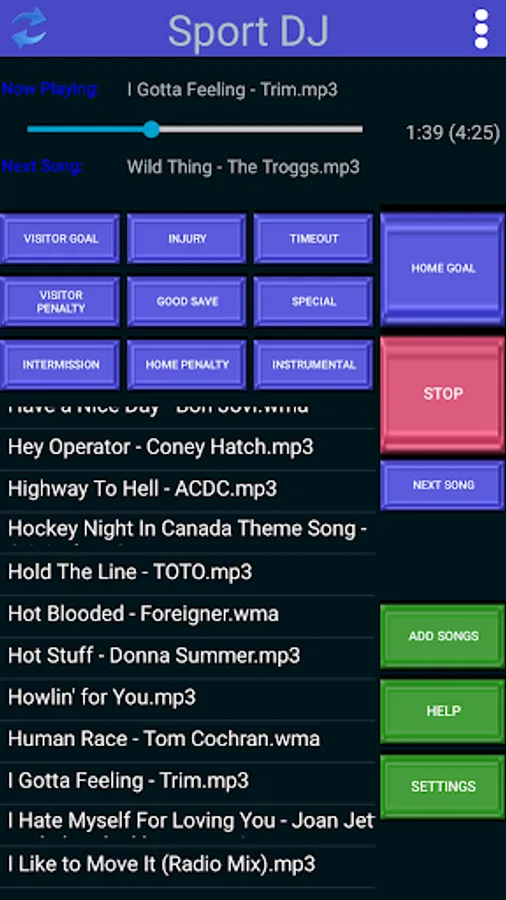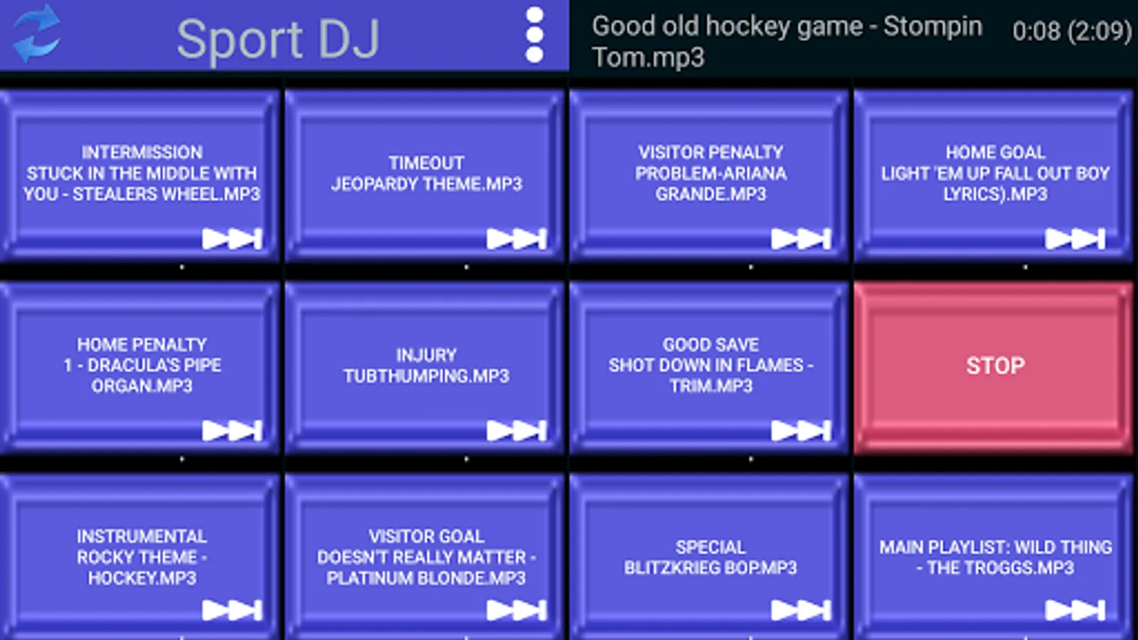 The application features 10 different playlist buttons for various events during the game such as for a home team goal, a good Save, a visitor penalty or goal, timeout, intermission, home team penalty, instrumental and after the player gets up from an injury. You can customize the button names for any events you want or to fit any other sport.