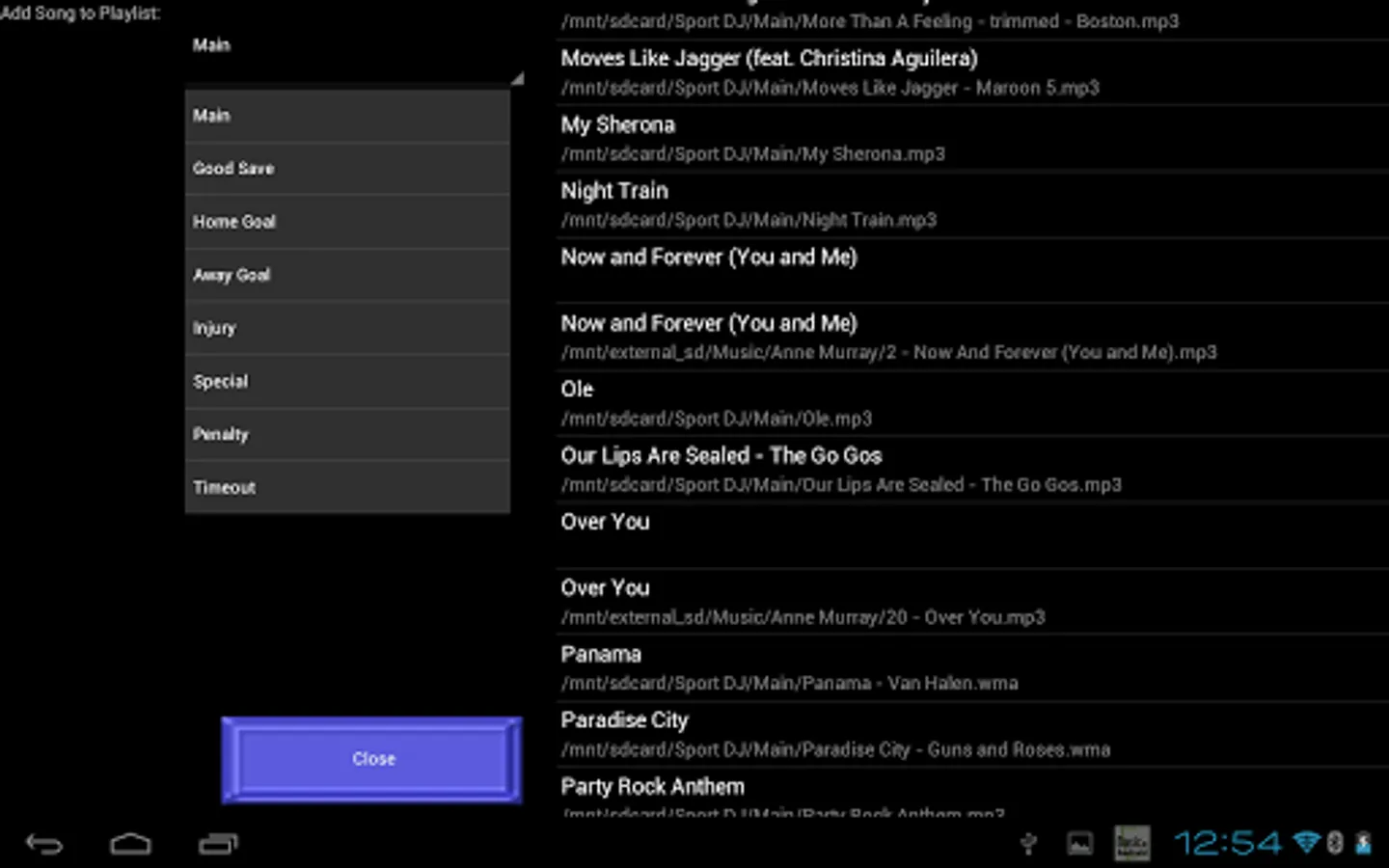 Sport DJ is an application specifically designed for playing music at sporting events. It allows you to play exactly the right song at exactly the right moment. While it was designed for Hockey and Lacrosse it is great for football and baseball and can be used for any event where music is played between or during play.
