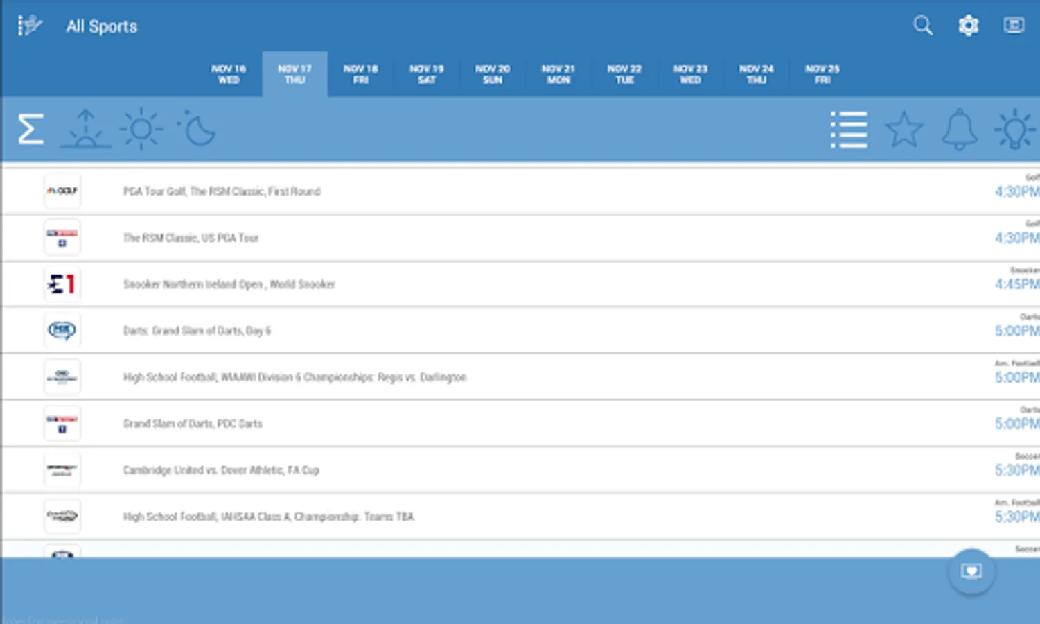 - Refine fixtures by channel, sport, date and time of day