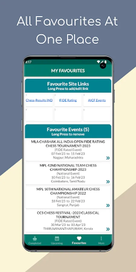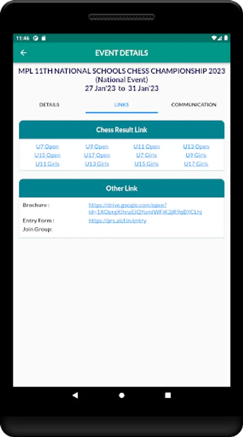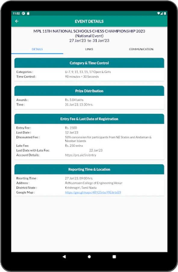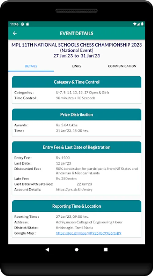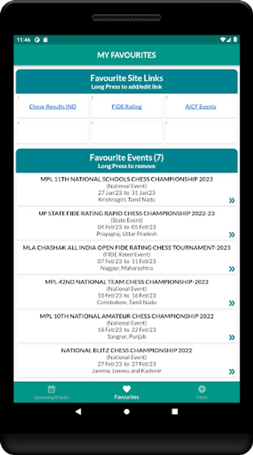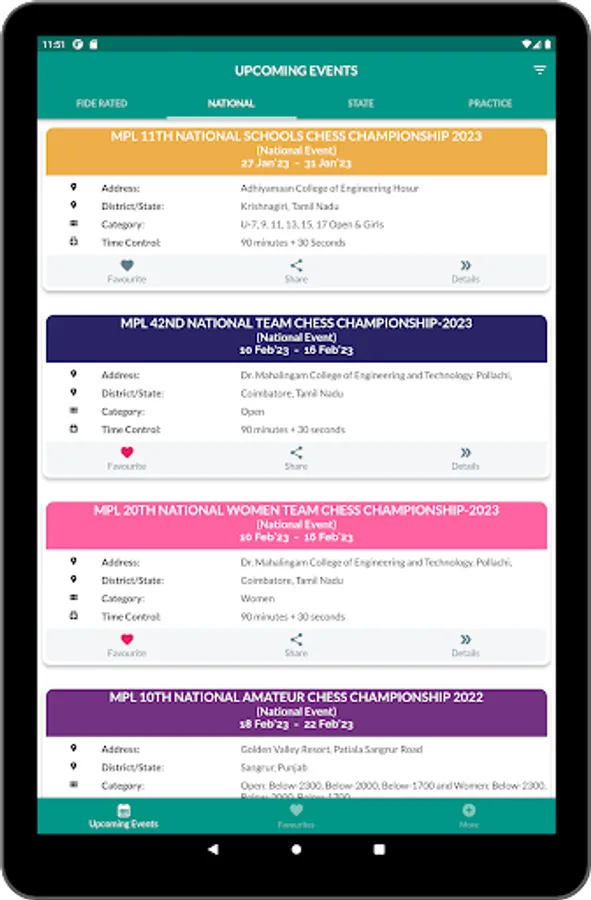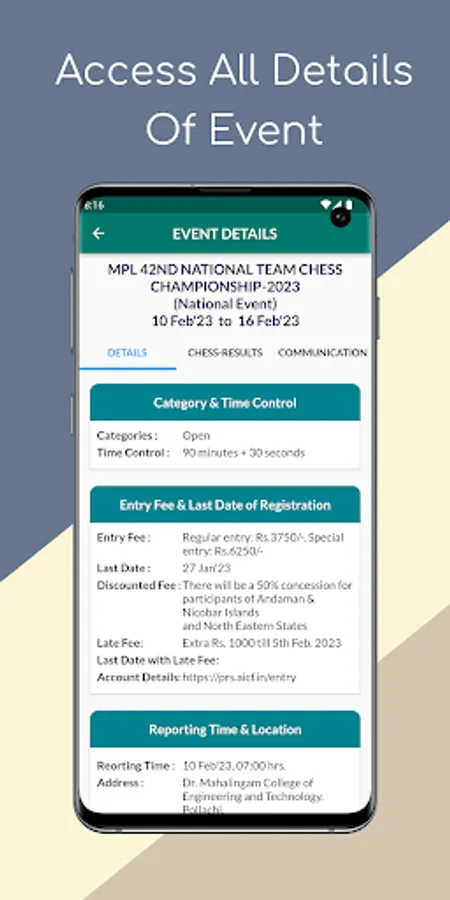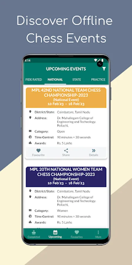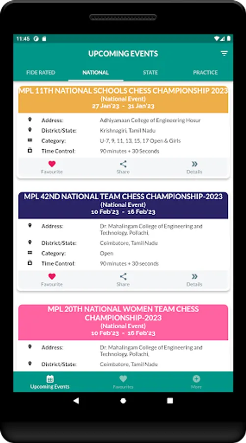 Organizers can add their events to the app, making it easier for chess enthusiasts to discover more and more FIDE Rated/National/State/Practice tournaments. Whether you're a seasoned pro or just starting out, this app is the perfect tool to help you find and participate in the chess events that matter to you.