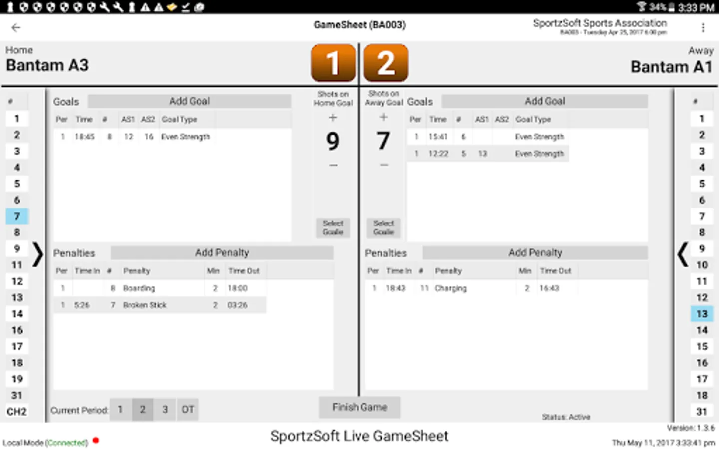 Provides game sheet scoring for sports games managed by the SportzSoft system. Set game rosters, add goals, record penalties, track officials, and record goalie stats. The app supports fast game sheet entry in an offline mode such that an internet connection is not required. Game data is prepared before the game by pulling from the SportzSoft server database, and then posted either live during the game or after the game when an internet connection is available.