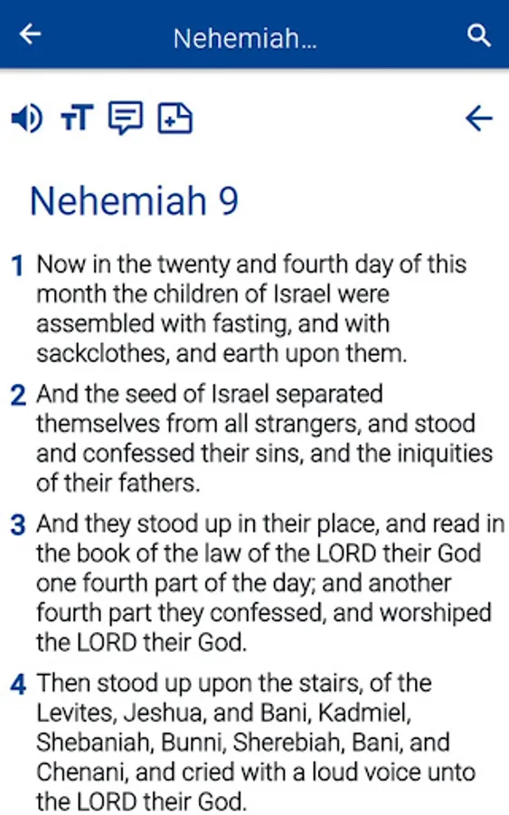 Touch the audio icon to select the chapter or verse you want to hear. You can adjust the sound settings (speed, volume, treble, bass, etc.)