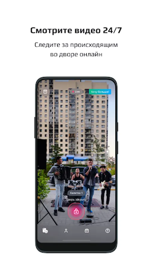 Watch courtyard cameras in real time, as well as cameras installed in the elevator or on the floor. Easily switch between cameras on the app's main screen.