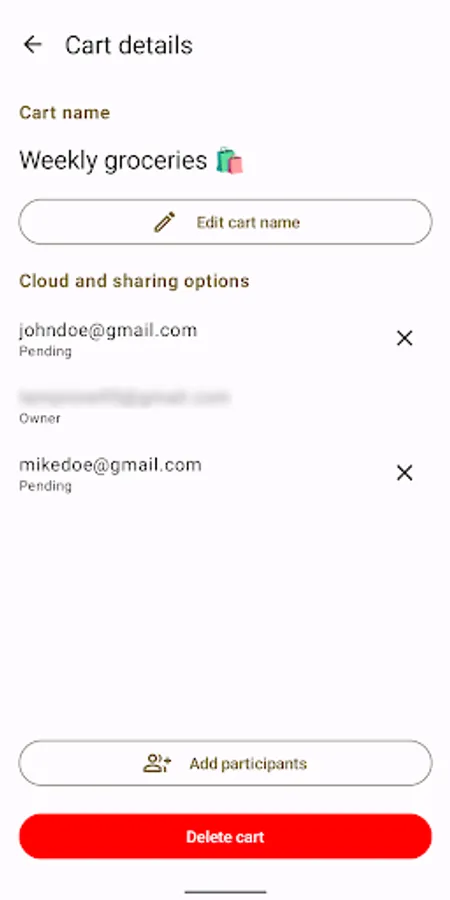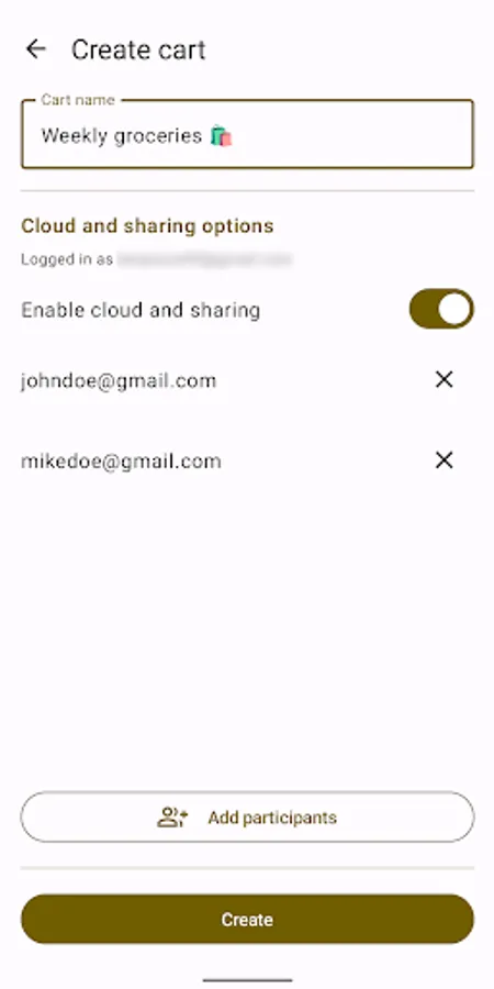 Shopping Cart is online, you can synchronize your carts across your devices or keep them just on your phone. You can also share your carts with your family and friends and contribute to theirs.