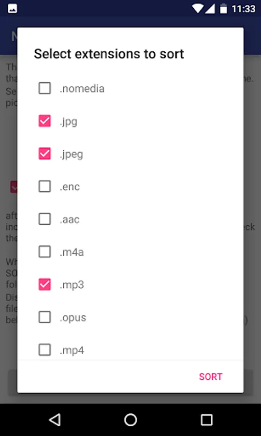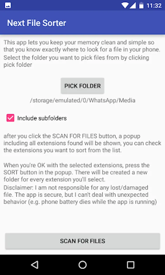 In 3 steps, Next File Sorter search in your phone folders for every different kind of file (by its extension), then let you decide which files are you OK to move and sort.