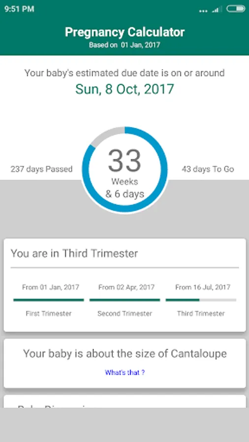This Pregnancy Calculator Application calculates your baby's estimated due date based on the date of the first day of your last period.
