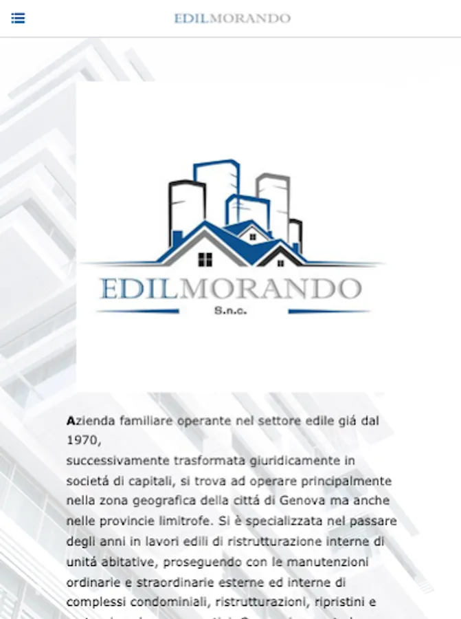 subsequently legally transformed into a joint stock company, it operates mainly in the geographical area of the city of Genoa but also in the neighboring provinces. It has specialized in passing the years in building internal restructuring works of housing units, continuing with ordinary and extraordinary external and internal maintenance of condominium complexes, renovations, restorations and restorations, including conservative ones. Subsequently it has expanded its business with new construction from ground to roof of small buildings for residential use and construction and / or renovation of buildings for industrial use, adaptation to safety regulations, fire prevention regulations and removal of architectural barriers, changes in destination d 'use.