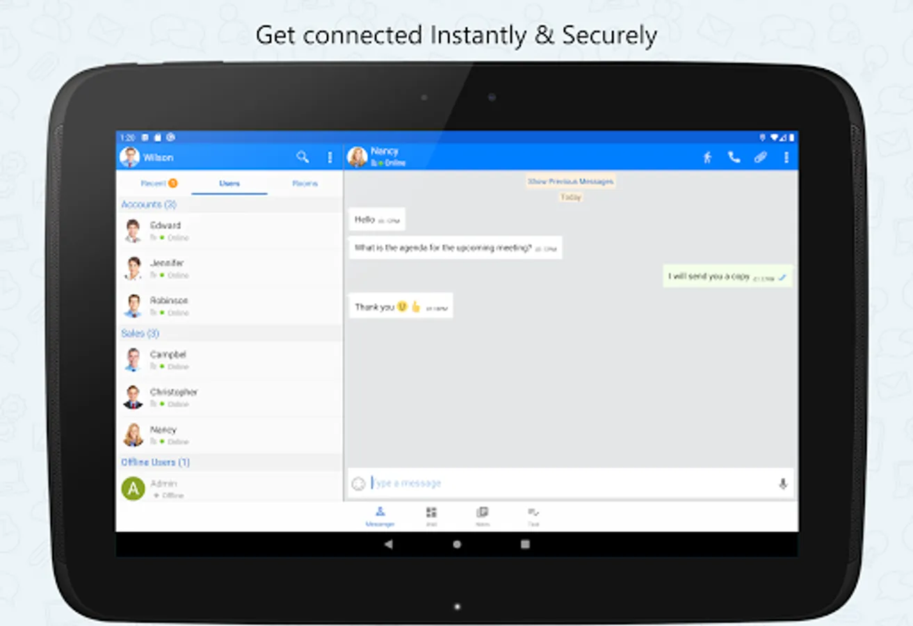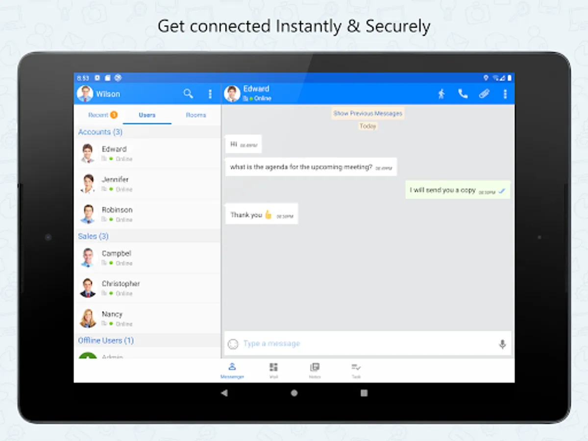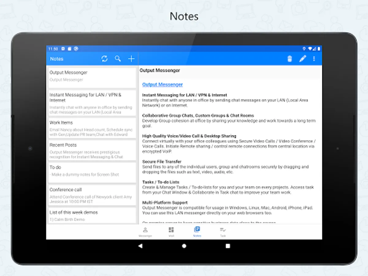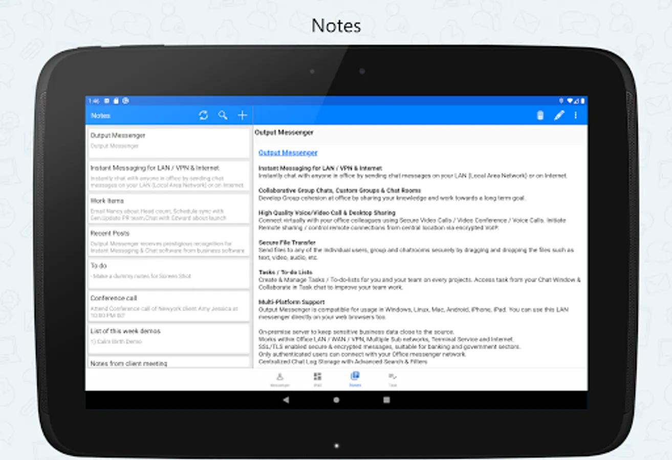 This Android Mobile app extends the power of Output LAN Messenger to your Smartphone & Tablet bringing Instant Messaging, Group Chat, File Transfer and several other features. Software features are tailor made to improve collaboration between teams to work together efficiently within office campus's and remote sites. The On-premises server and high level encryption technology ensures privacy and confidentiality for internal communication in the small, medium and corporate environments, hospitals with HIPAA regulations, and in the government and banking sectors.