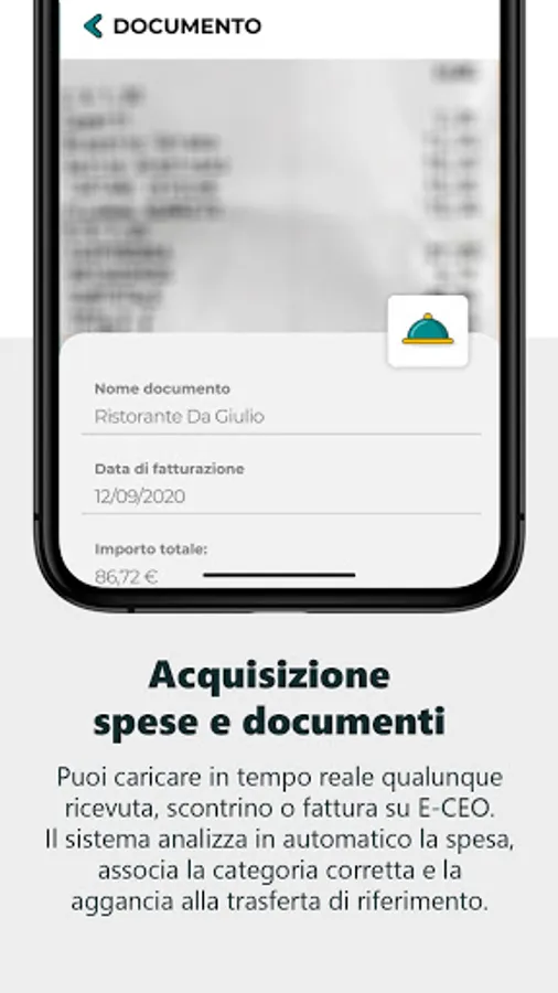 - Upload and keep any receipt, receipt or invoice in real time. The system automatically analyzes the expense, associates the correct category and links it to the reference trip.