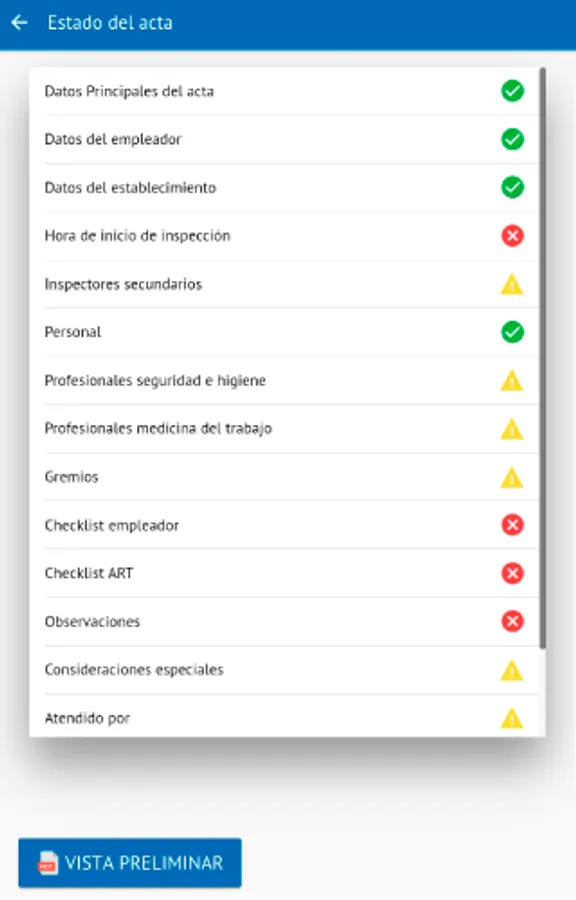 Status of the minutes, the sections are listed, indicating with colored icons the status and the obligation of the same.