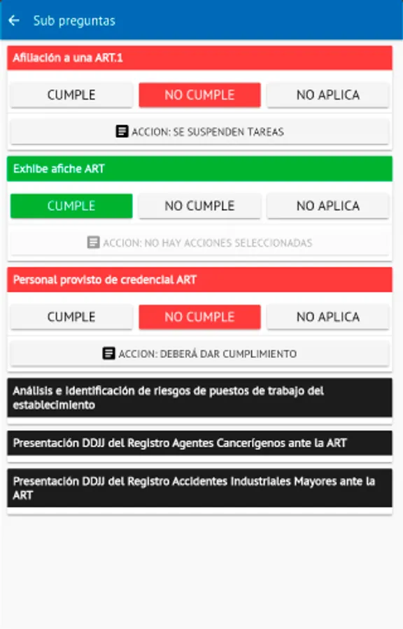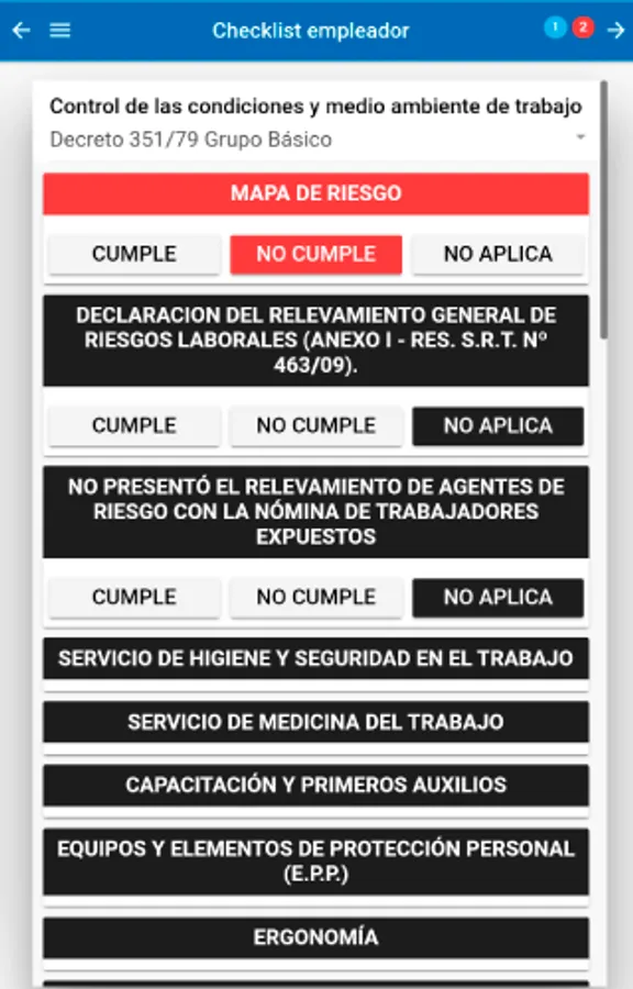 In Control of working conditions and environment, a checklist is displayed with the items that the employer complies with or does not comply with the current regulations.