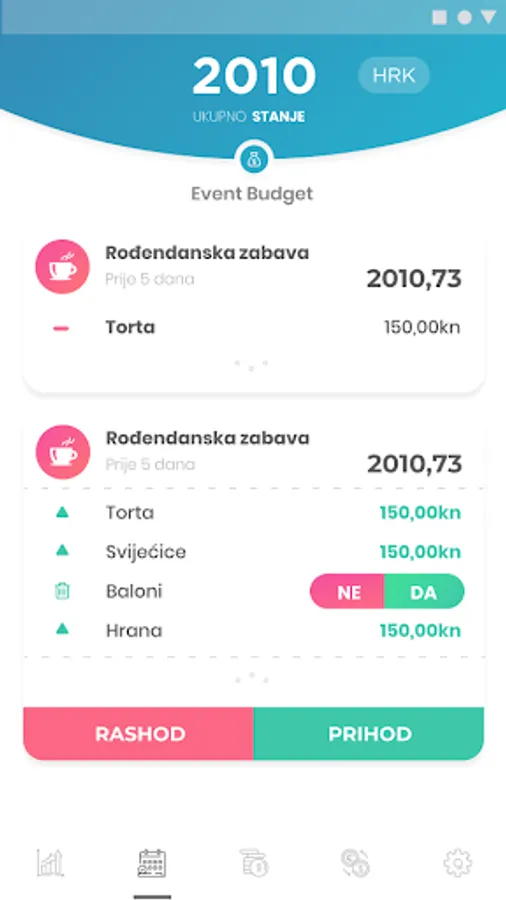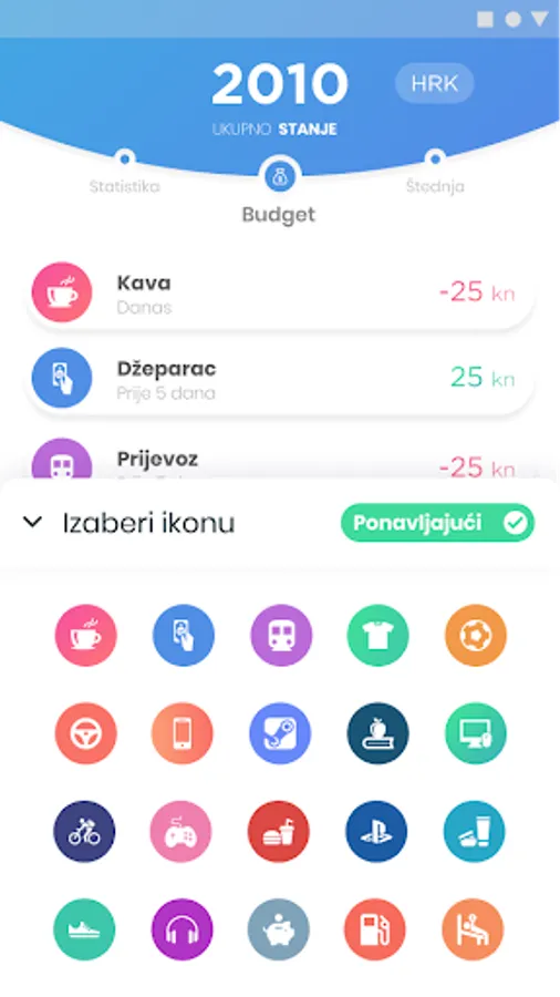 Expenditures - are divided into categories (food, games, coffee, transportation ...), by decreasing their available budget by entering them, and adding recurring expense