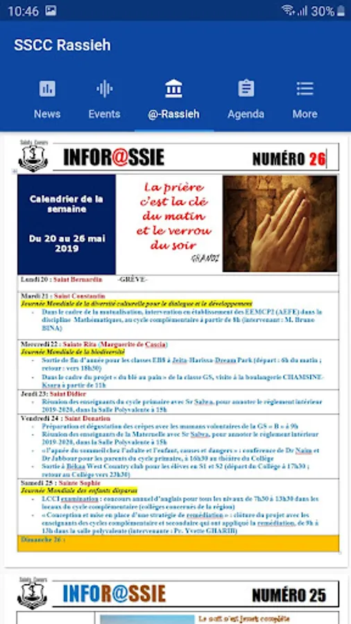 -Un calendrier vous tenant au courant de toutes les actions culturelles ou éducatives qui vont avoir lieu durant la semaine ;