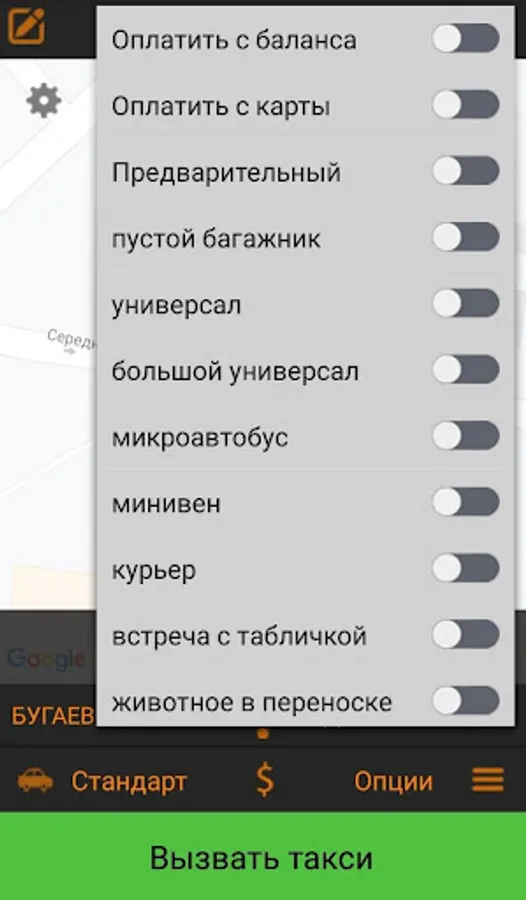 5. Specify the options such as "Baggage in the cabin", "5 passengers", "Delivery", "Animal", "Air conditioner", "Minibus", "Station wagon", "Child seat", "Light up the car", etc. d.;