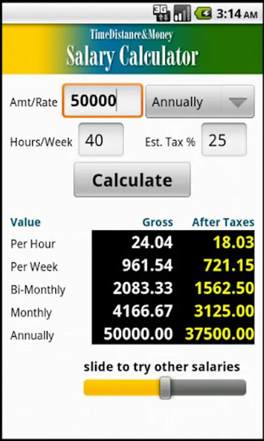ranging from a week all the way up to a year. The slider bar lets you add to or subtract from your "test" salary figure in 5 percent increments - see what a small bump will do for your take-home pay, or see if you can cut your salary quote to that prospective employer to stay competitive with other job candidates!