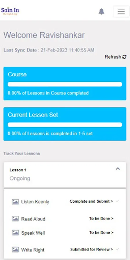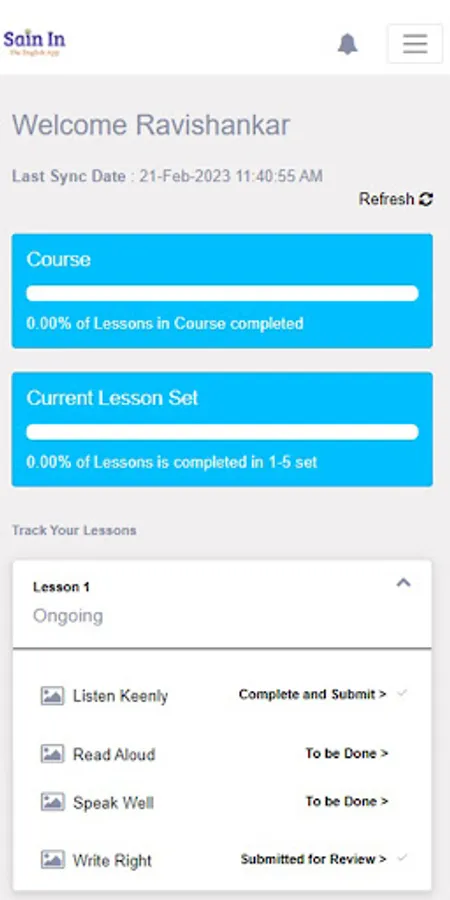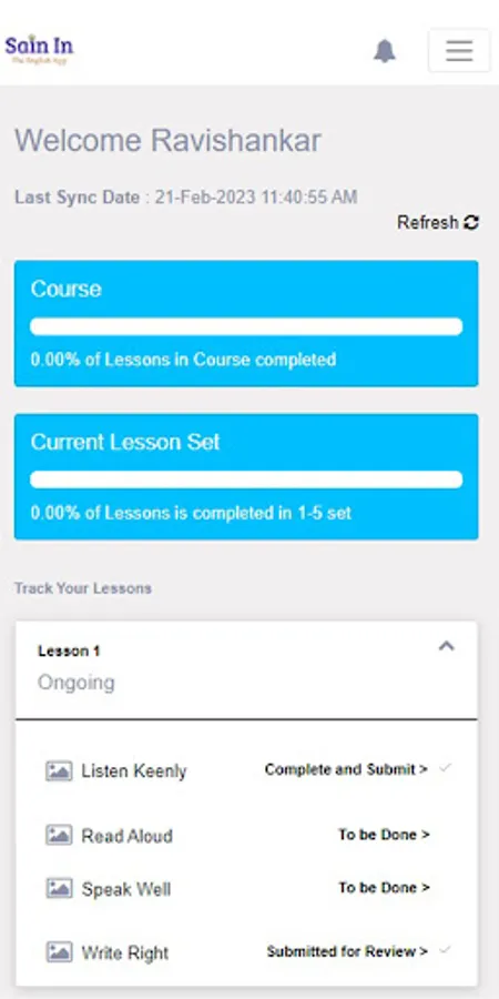 (b) What is the SAIN IN APP? – Most school teachers, adult learners, and youth in India who come with a vernacular background do not have the necessary confidence and skill sets to communicate in English. The SAIN IN - THE ENGLISH APP aims to provide a self-paced online platform for these learners to learn the language with adequate guidance and support from assigned mentors, who provide this service on a voluntary basis. The APP guides the learners to learn, post queries, complete lessons and submit assessments with their mobile device without the need to be online at all times. It also facilitates mentor review and provides online guidance to the learner. The APP has provision for audio submissions for speaking and reading related lessons.