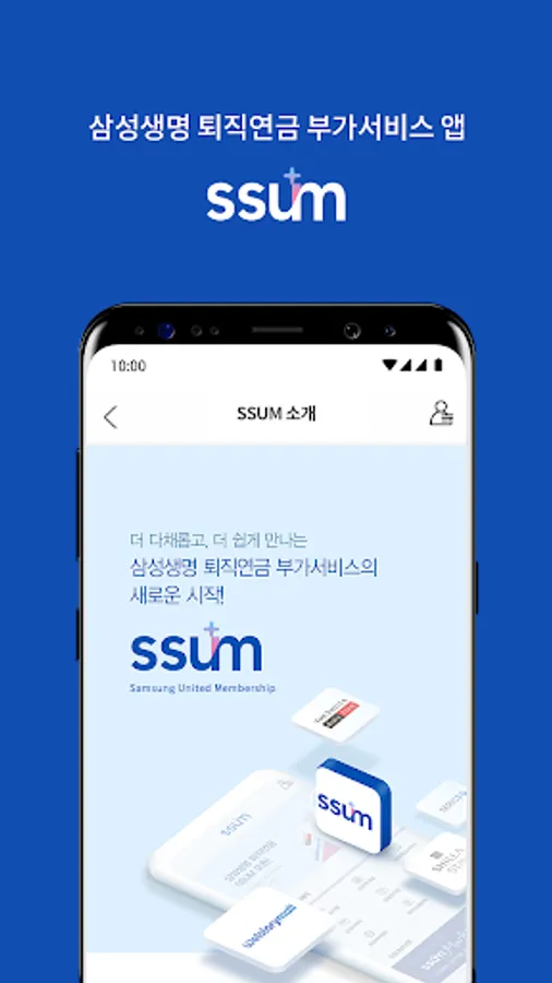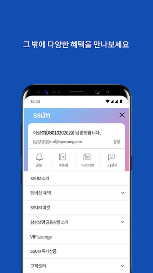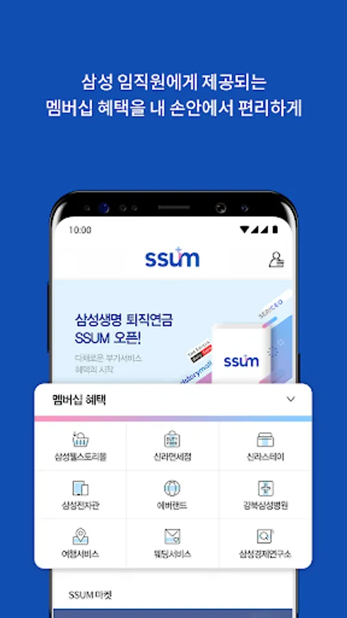 Samsung Life Insurance's SSUM application is a collection of various benefits provided as additional services. From Samsung Electronics' products, Welstory Welfare Mall, Shilla Duty Free Shop, Shilla Stay, Knowledge Information Service, Everland, Gangbuk Samsung Hospital, travel services that add benefits to benefits, and personalized wedding services for members, you can easily find special benefits here. .
