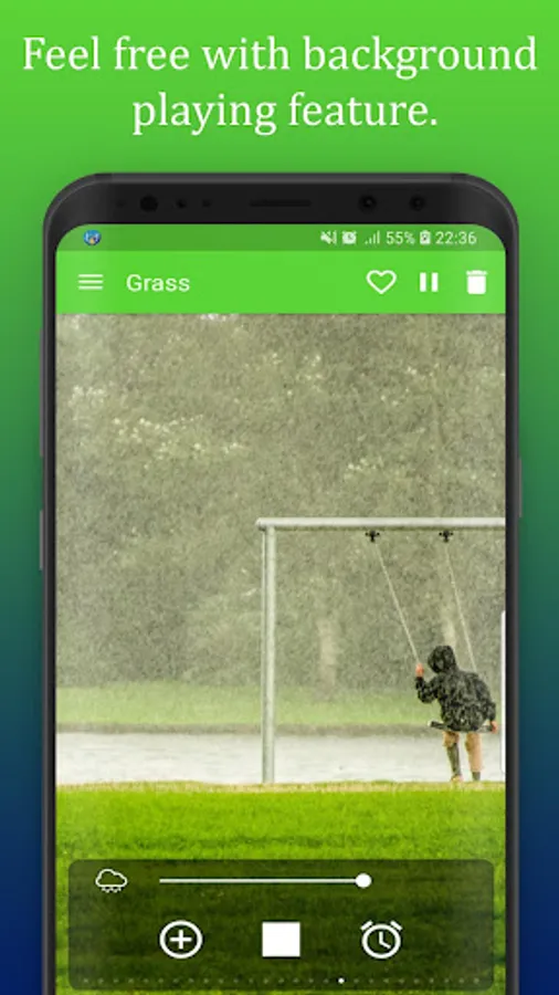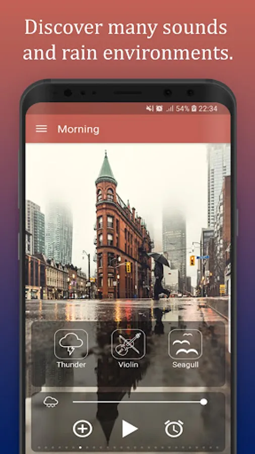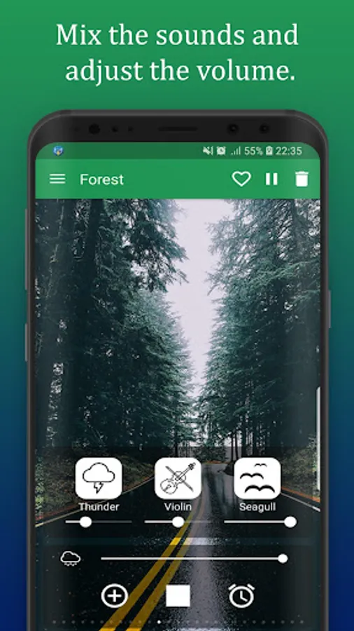 Enjoy a variety of rain sounds divided into different environments. You can mix many rain sounds, nature sounds, white noises, peaceful sounds, relaxing musics, thunderstorm sounds and adjust the volume of each of them to create your own relaxed ambience based on your mood.