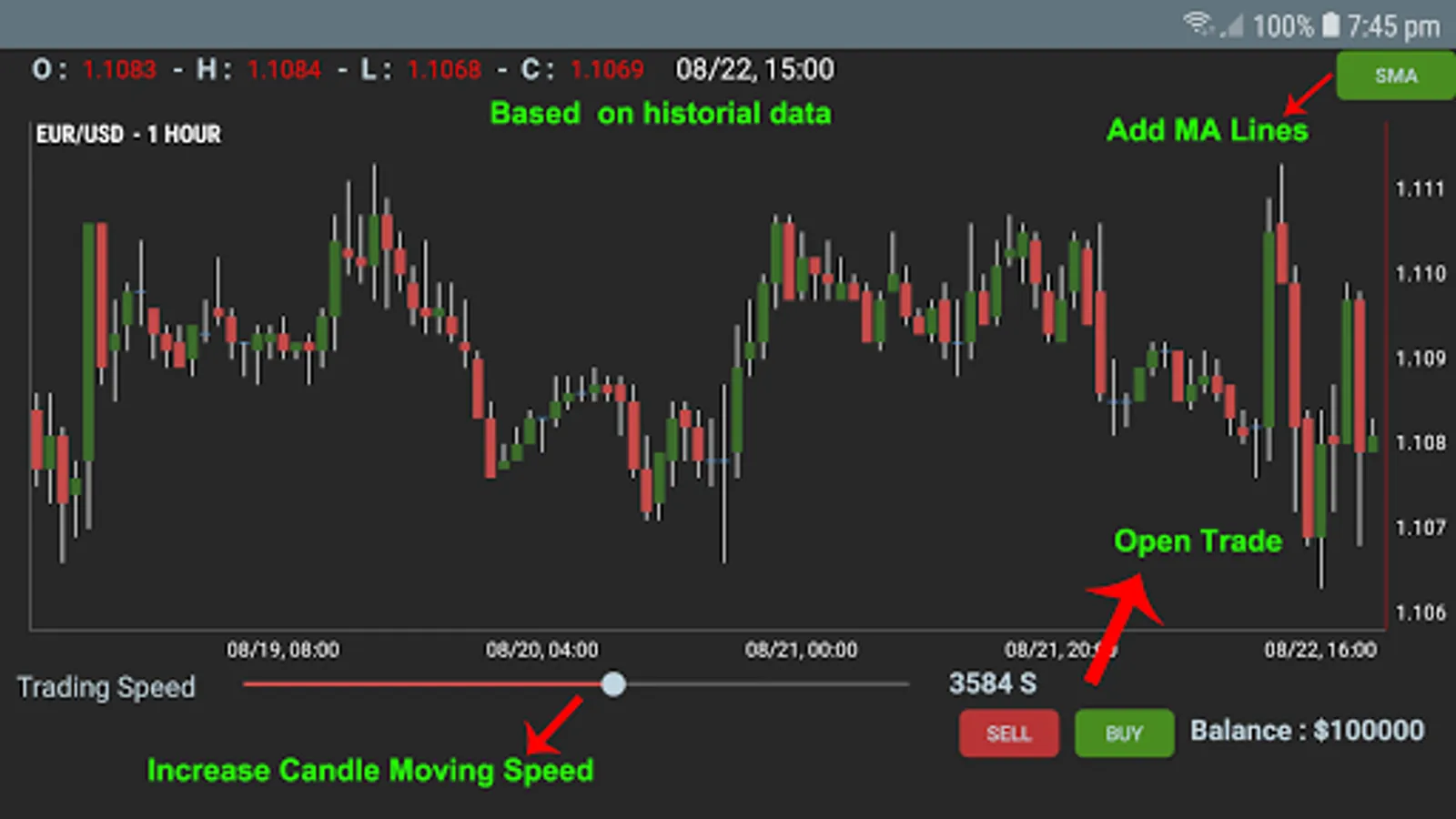 Main part of this app is "Fast Trading" in Forex demo account, now you don't need to wait 1 hour before trade. 1 hour Candle move in just 20 Seconds. (Practice on Historical candles)