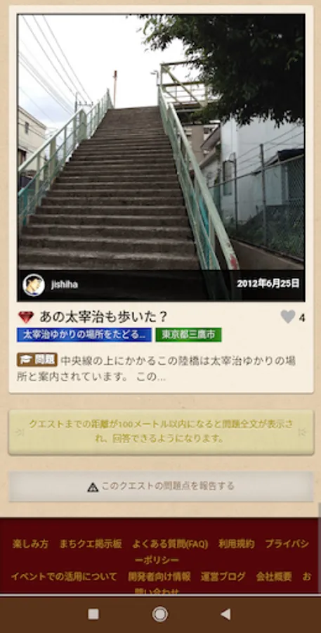 - クイズはたとえば「あの太宰治も歩いた?この陸橋は、19〇〇年にできあがったものなのですが、さてこの〇〇に入る数字は何でしょうか?」といった感じです。ヒントはその周辺に!近くの案内板などに答えが隠されています。