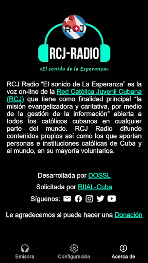 RCJ Radio "The Sound of Hope" is the online voice of the Cuban Catholic Youth Network (RCJ) whose main purpose is "the evangelizing and charitable mission, through the management of information" open to all Cuban Catholics in Any part of the world. RCJ Radio broadcasts its own content as well as that provided by Catholic people and institutions from Cuba and the world, mostly volunteers.