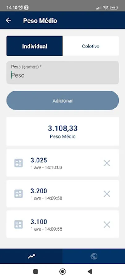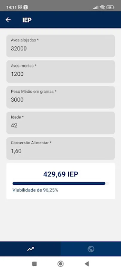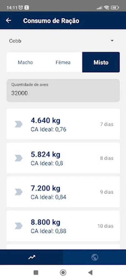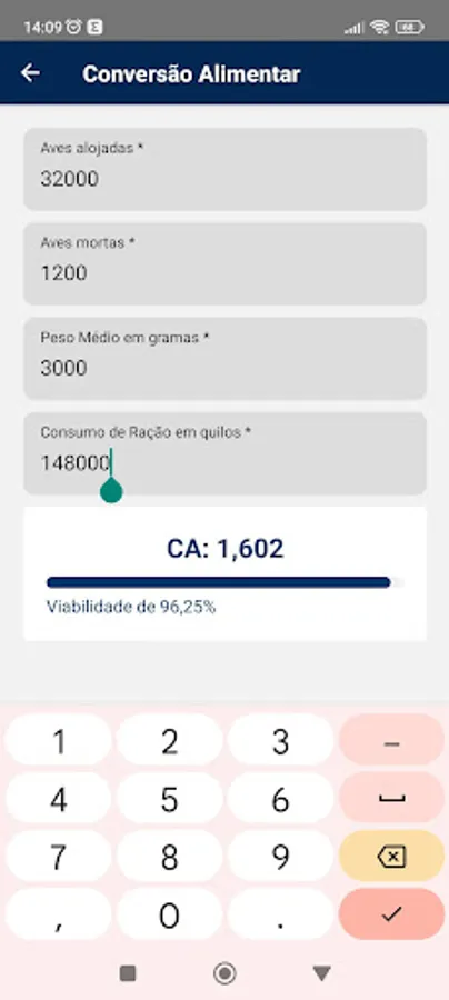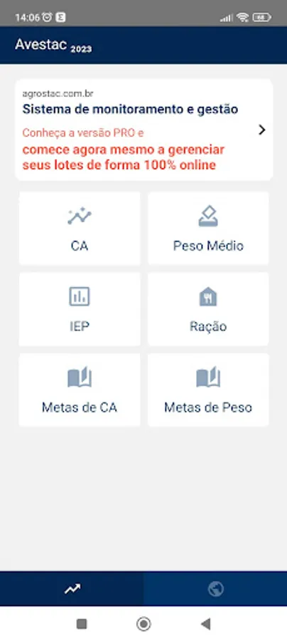 Avestac is an application developed to help poultry farmers in the management of their aviaries, from which it is possible to calculate feed conversion, average weight, IEP and feed consumption. The latter presents the ideal amount of feed that should be consumed by the batch in order to reach the ideal feed conversion.
