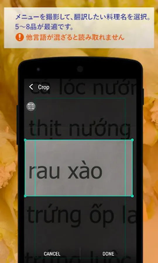全く読めないベトナム語のメニューをカメラで撮影、読み取った単語を選択するとメニューの日本語訳が表示されます。