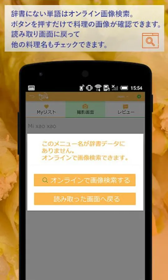 アプリ内辞書に登録がない場合でも、オンラインで画像を検索することができます。料理の画像を見れば料理の内容が判断できます。