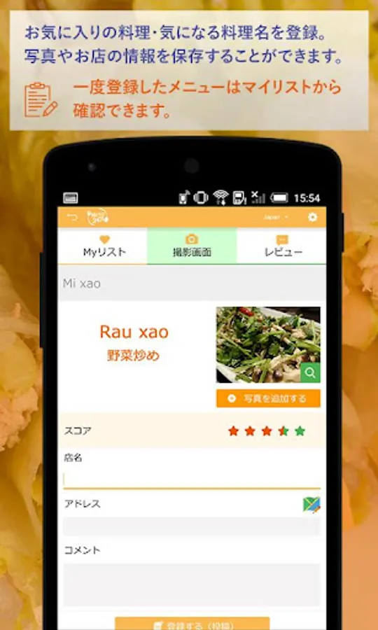 気に入った料理は、写真やコメントと一緒に保存できます。