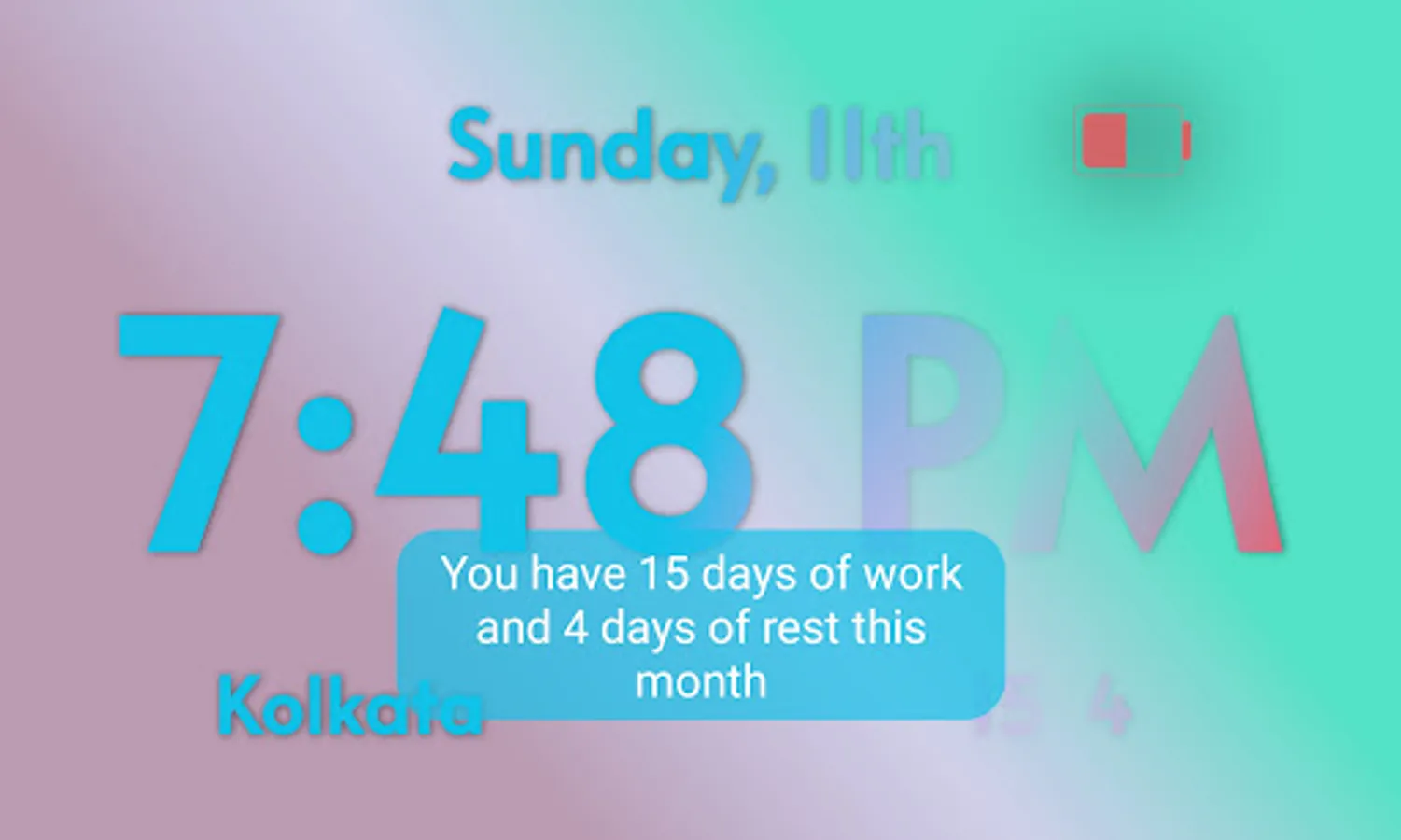 6. Shows how many days are left in the current month for work & play. (Calculated from Mon-Fri as work & Sat-Sun as Play)