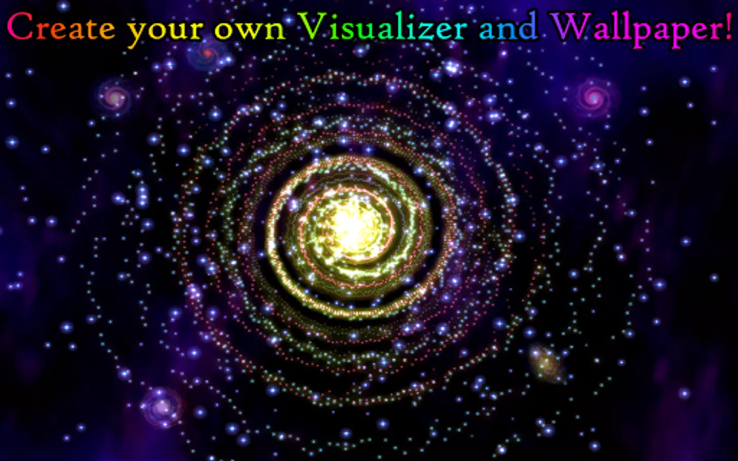 Travel through the endless star fields of this majestic spiral galaxy! Personalize your phone with all of the stars in the galaxy. The music will generate the colors in the visualizer, so a new galaxy is created for each piece of music. Let your favorite music light up the stars on your journey.