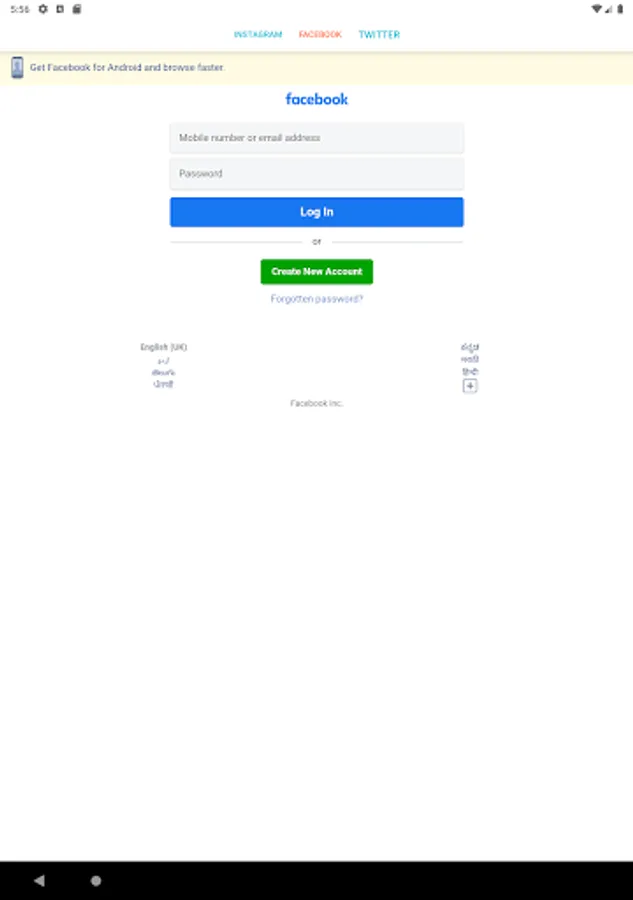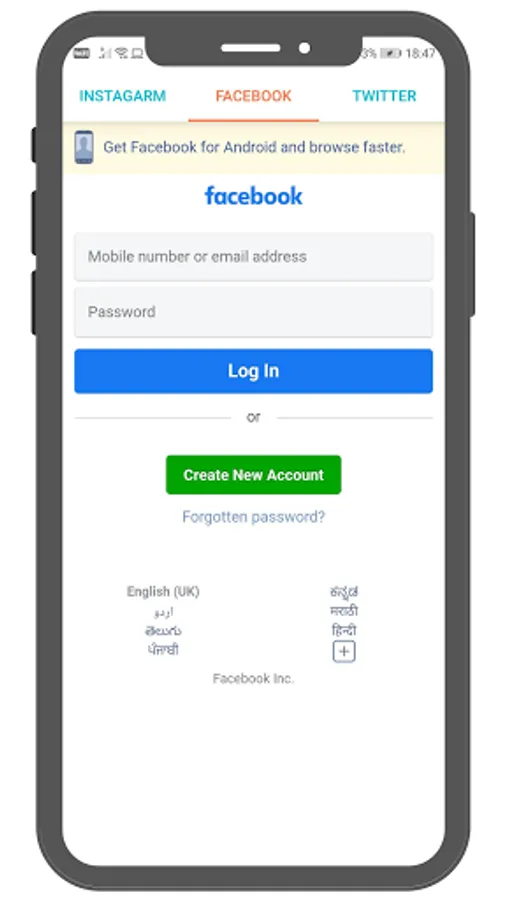 You can use Facebook, Instagram and Twitter without sacrificing your battery or mobile storage. Social app is a light-weight app that allows you to access all 3 social networks in their mobile-friendly web interfaces and with the look & feel of the original apps.