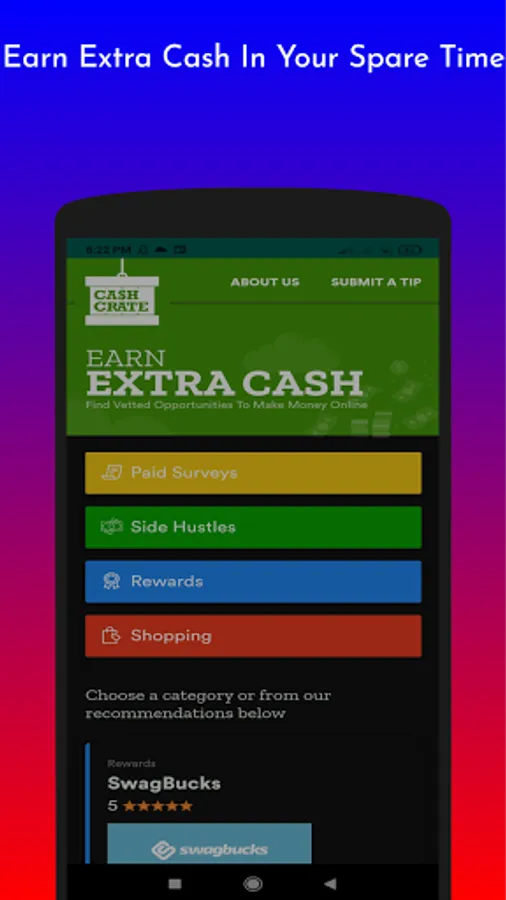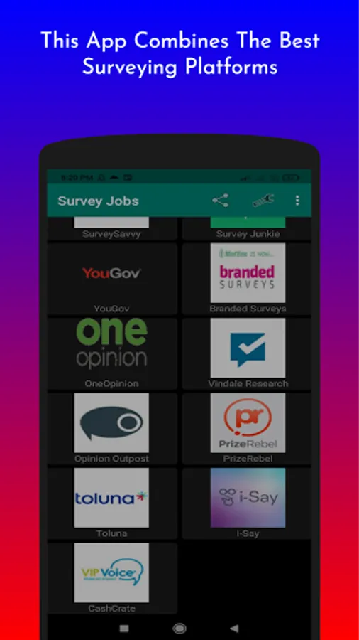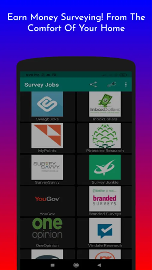This app provides links to some of the wonderful survey platforms like swagbucks, inboxdollars, mypoints, pinecone research, surveysavvy, survey junkie, yougov, branded surveys, oneopinion, vindale research, opinion outpost, prizerebel, toluna, i-say & cashcrate.