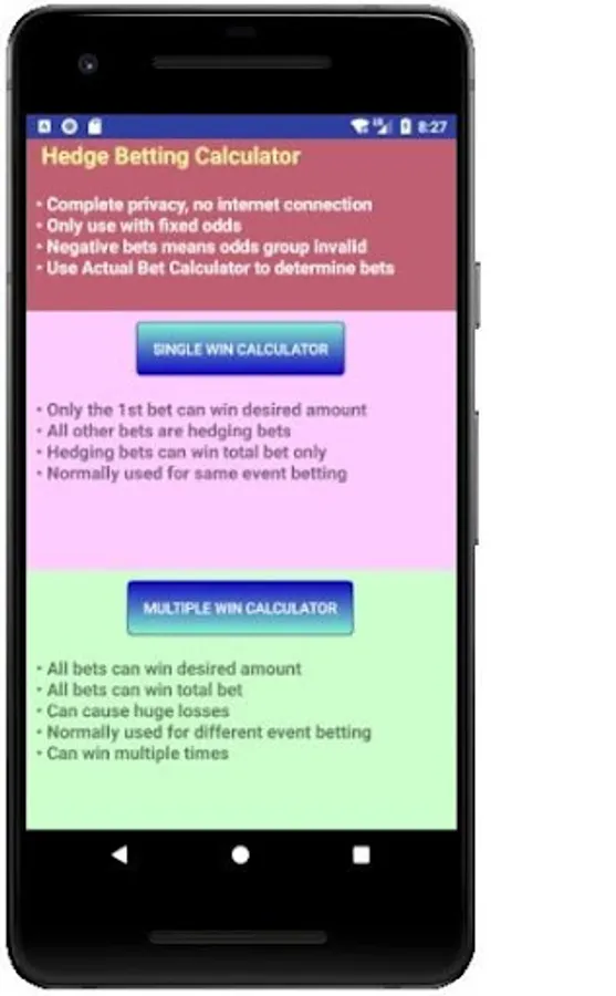 Hedge betting Calculator Pro calculates winning and hedging bets giving both Single and Multi Win options from 1 to 8 bets.