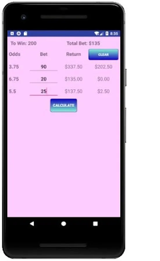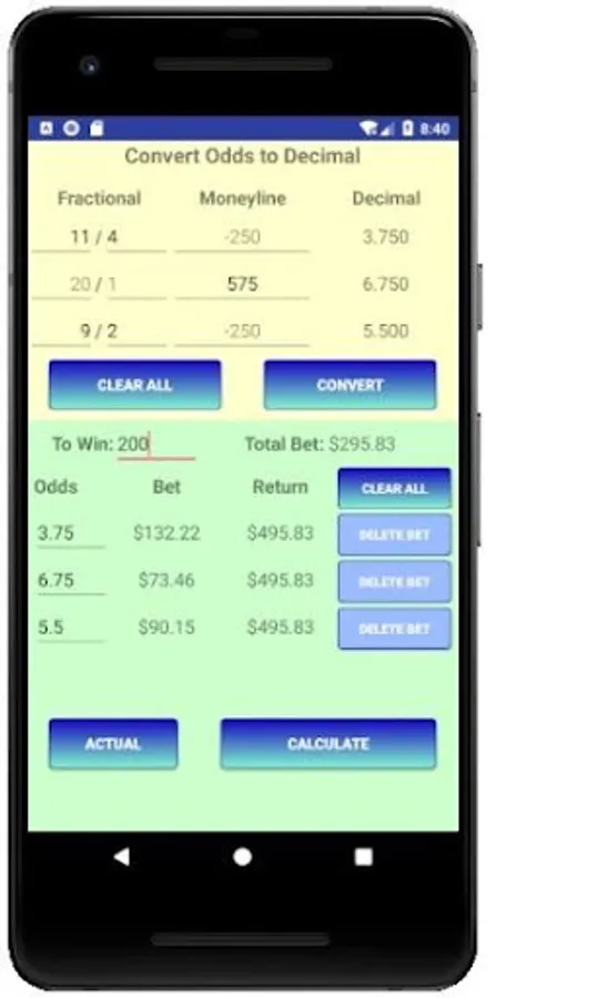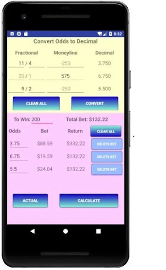 The Actual button takes you to the screen where the user will choose their actual bets. Adjusted bets are entered over the calculated bets and the results are displayed by tapping the Calculate button. If the user is unsatisfied with the results, they can return to the previous screen and make changes.