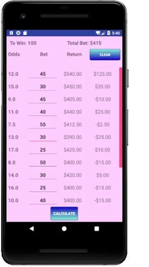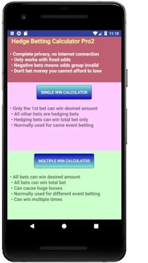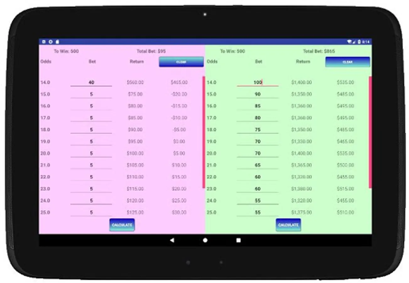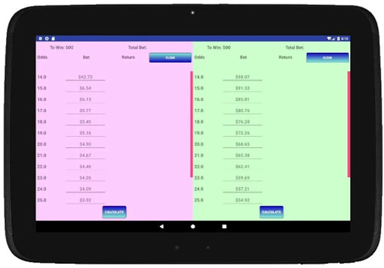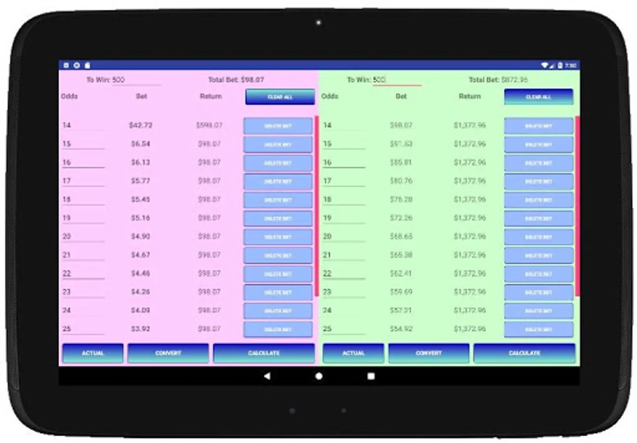 In both Single and Multi Win, tapping the Calculate button saves the input values and calculates the bets, returns and total bet. Each Bet belongs with the Odds from which it was calculated. If the user decides not to place one or more of the calculated bets, the calculations will be wrong for all bets.