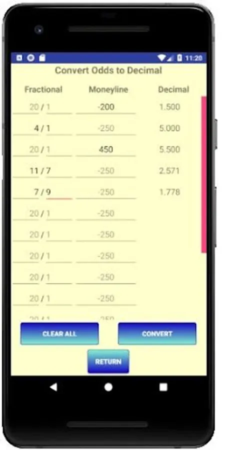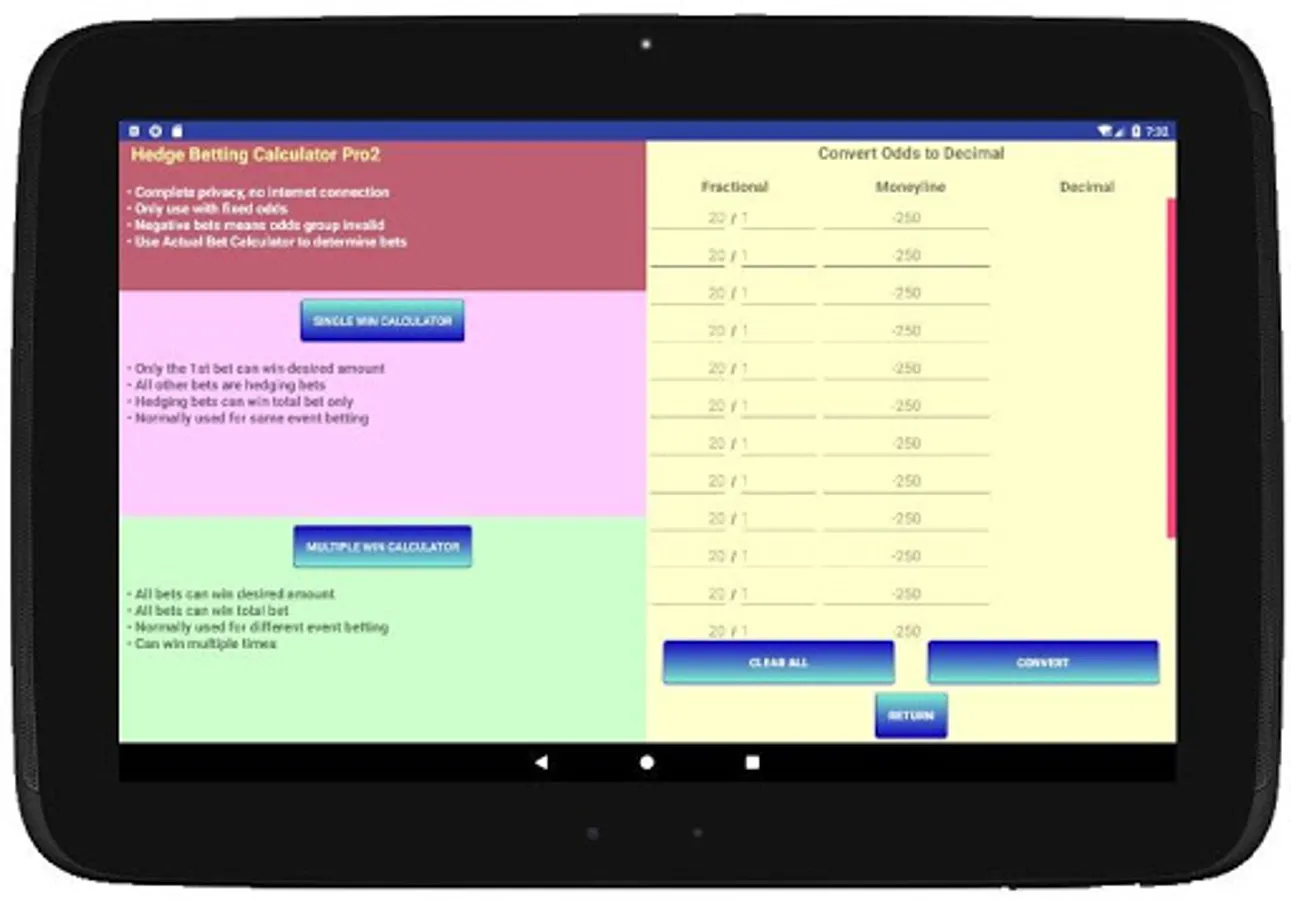 Hedge Betting Calculator Pro2 only takes decimal odds. A Fractional/Money Line to Decimal converter is provided to help with conversions. Tapping the Convert button initiates conversions and saves the input values. Tapping Return returns the user to the Win Calculator and transfers the Decimal Odds into the Calculator if there is enough space for them. To clear inputs permanently, tap Clear All then tap Convert and the empty states will be saved.