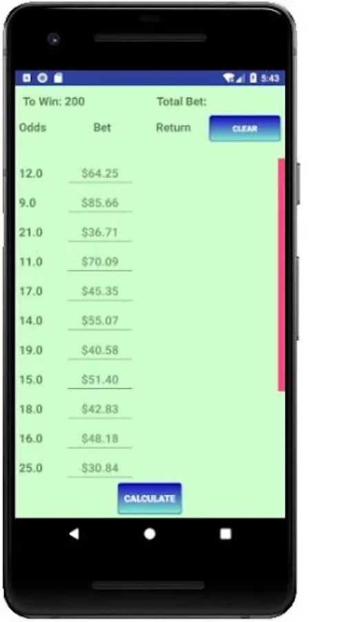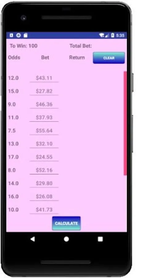 The user enters the amount they wish to win in the 'To Win' and the odds they wish to bet on then tap the Calculate button. It displays how much to bet on each odd for hedging purposes, the win value if the bet wins and the total of all bets.