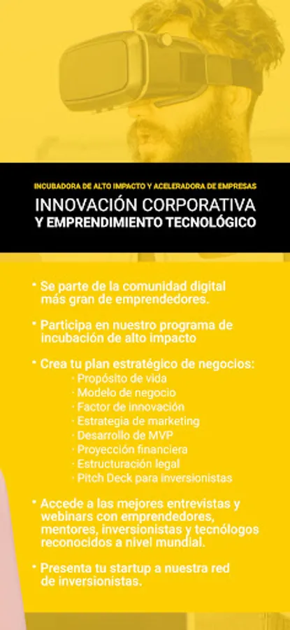 Technological platform to help you create and grow your company or startup, through the implementation of the High Impact Incubation and Business Acceleration Programs, where you will learn from finding your entrepreneurial life purpose, to raising private capital before Angel Investors, passing by methodologies such as Design Thinking, Lean Startup, Business Model Canvas, Inbound Marketing, Strategic Business Management, Product Management, Intellectual Property and Brand Registration, Incorporation of Companies, Accounting for Startups, Branding, Innovation, Corporate Governance, Business Coaching , Quality Control, among many other topics. Likewise, you will receive mentoring, coaching and continuous and real-time business consultancies by livestream, while you create your business model from the mobile application of STARTCUPS, the most important Business Incubator and Accelerator in Latin America.
