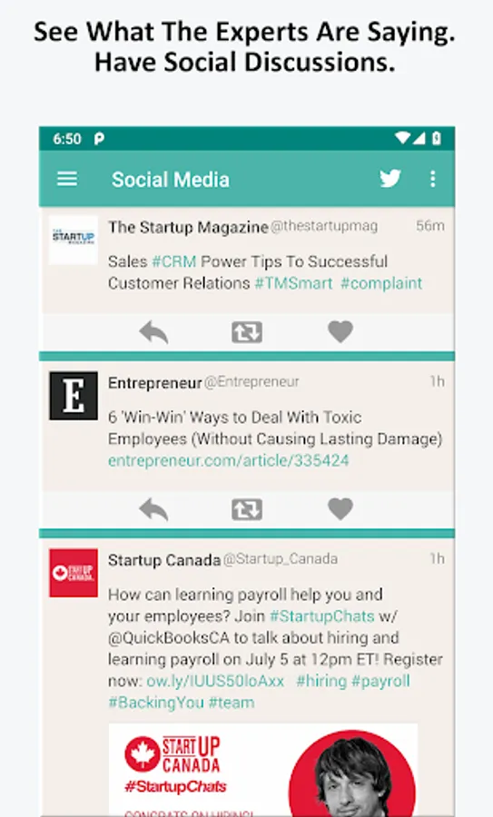 -- Discussion feed that aggregates news sources, and personalities from the Startup business world into a single list of tweets, so you can hear what everyone has to say and respond to them in real-time.