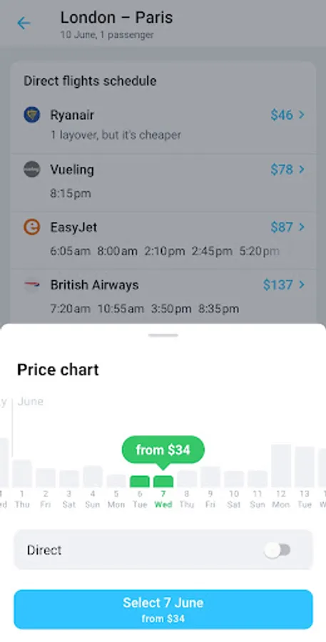Just enter the country of arrival and departure, the departure date and the system will automatically find you all available airfare for those dates with your criteria.