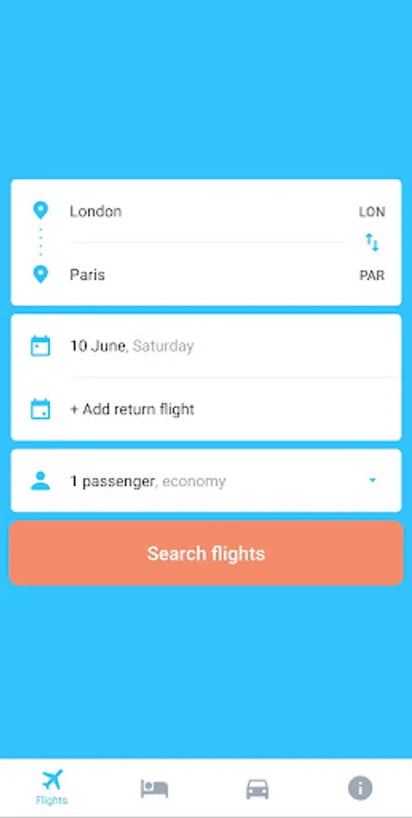 Buying tickets through our application you not only save money by comparing tickets for different airlines, but also time, because the purchase of the ticket is made in minutes.