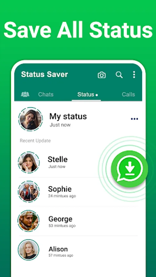 Have you seen a friend's status? But can't find a way to save that video status? Then download this status saver & status downloader. Save every image or video status from WA. Now you can easily save status and restore deleted messages and deleted media with the status downloader. Status saver for Android is available in small size and exactly what you need. This status saver for WA is simple and easy to save photos & video status.