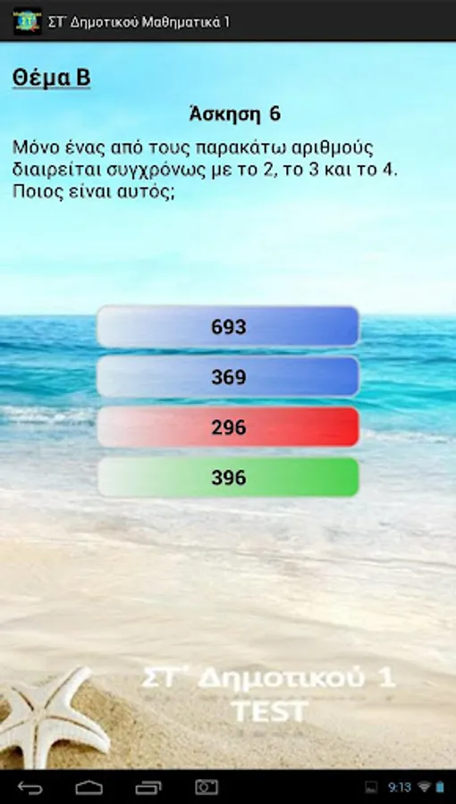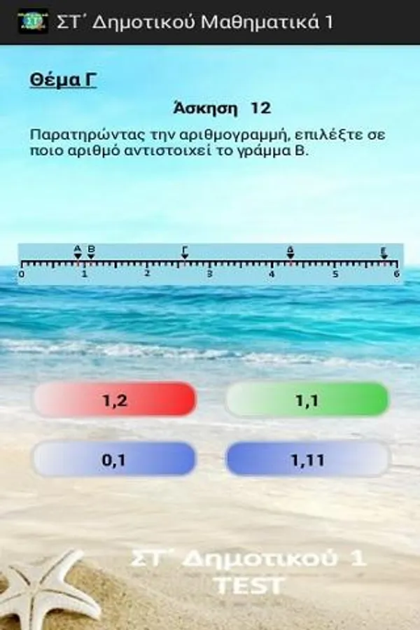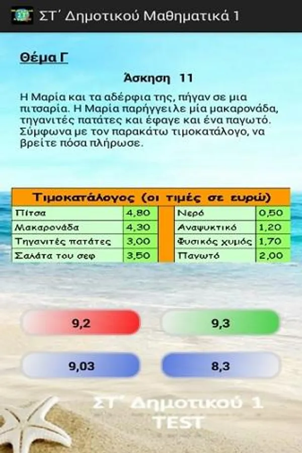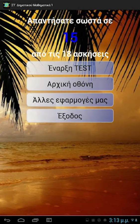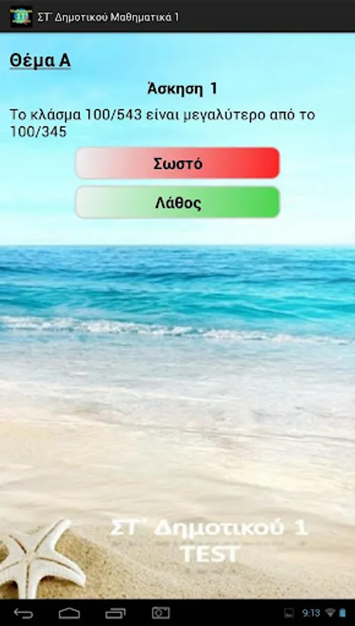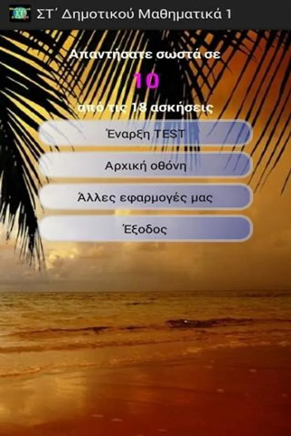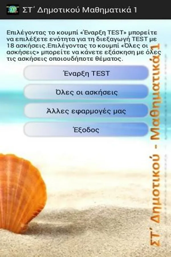 Everyone wants a continuous TEST of 18 exercises in 4 themes (True - False, Multiple Choice, Vacancy, etc.). The exercises in this case are randomly chosen from the application's exercise base, and for that reason never two TESTs will be the same, since millions of exercise combinations are created without exaggeration. The pupil in a short time can control his knowledge without the tedious but mostly time-consuming writing.